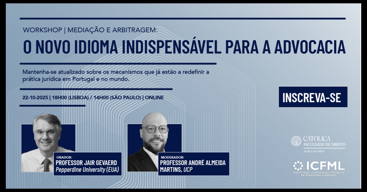 A Faculdade de Direito da Universidade Católica Portuguesa – Escola do Porto, em parceria com o ICFML – Instituto de Certificação e Formação de Mediadores Lusófonos, organiza no próximo dia 22 de outubro de 2025, às 18h00 (hora de Lisboa), o workshop “Mediação e Arbitragem: O Novo Idioma Indispensável para a Advocacia”, que decorrerá em formato online.