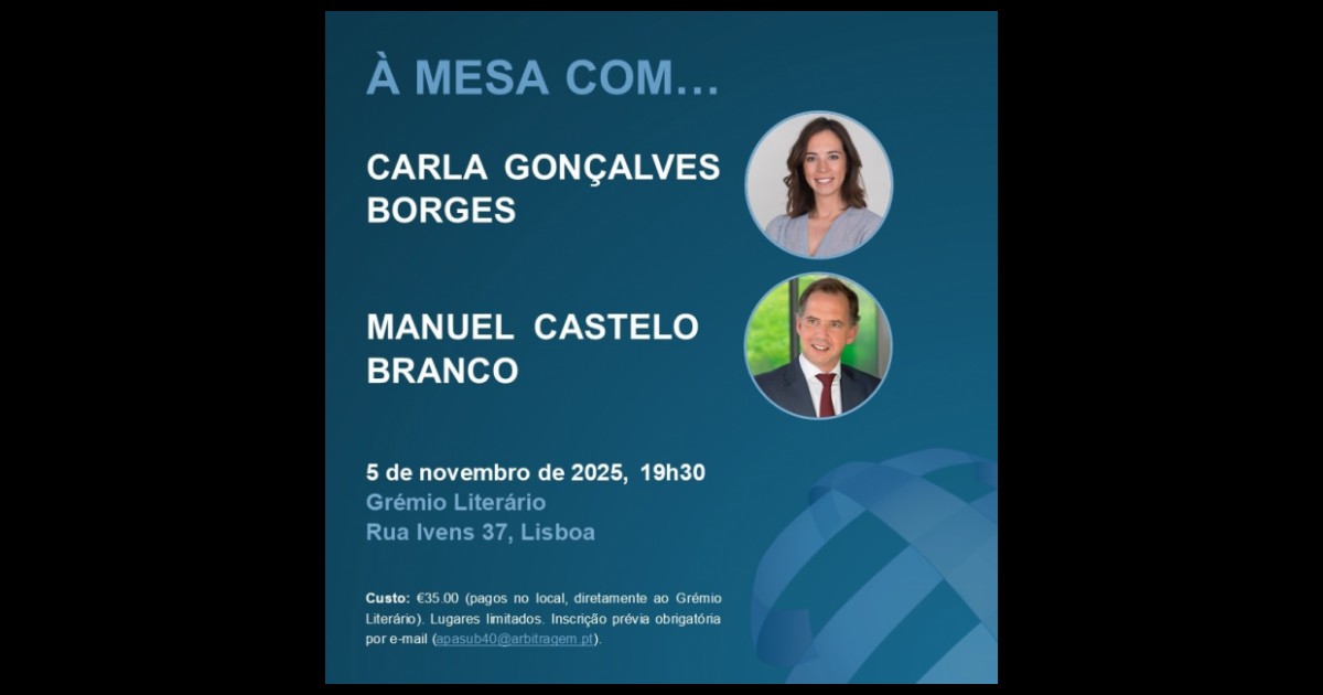 No próximo dia 5 de novembro de 2025, o Conselho Sub40 da APA Associação Portuguesa de Arbitragem desafia a comunidade arbitral portuguesa sub40 para o evento “À mesa com… Carla Gonçalves Borges e Manuel Castelo Branco”. Irá realizar-se no Grémio Literário, a partir das 19h30, sendo composto de jantar seguido de uma conversa com os convidados, que se pretende informal e animada, acerca do seu percurso profissional na arbitragem e como olham para o futuro. Será, além disso, uma oportunidade de reencontro e convívio para a comunidade arbitral jovem.