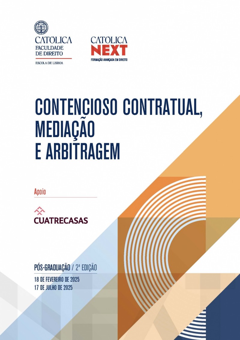 Terá lugar na Faculdade de Direito da Universidade Católica Portuguesa - Escola de Lisboa (UCP), entre os dias 18 de fevereiro e 17 de julho de 2025, em formato presencial, a 2.ª Edição da “Pós-Graduação em Contencioso Contratual, Mediação e Arbitragem”.