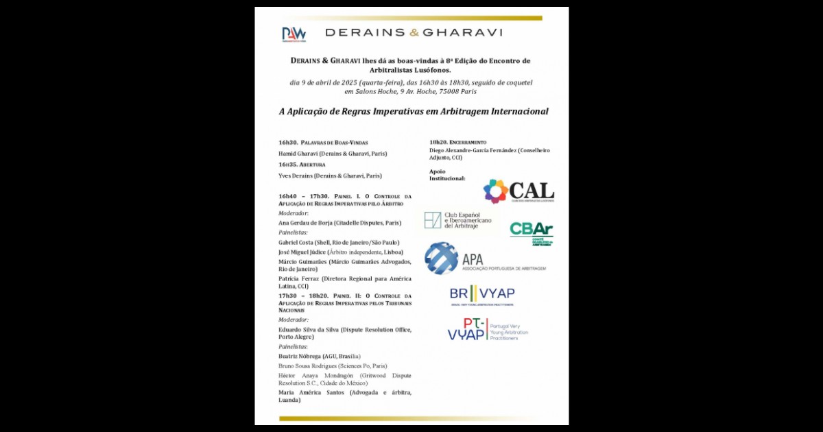 À semelhança de edições anteriores, a Associação Portuguesa de Arbitragem tem o prazer de apoiar institucionalmente o 8.º Encontro de Arbitralistas Lusófonos. Este evento, organizado pelo Clube dos Arbitralistas Lusófonos (CAL) terá lugar em formato presencial durante a Paris Arbitration Week.