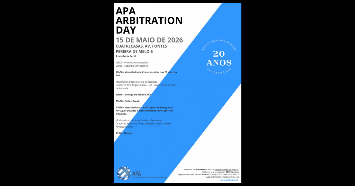 No APA Arbitration Day deste ano, que terá lugar a 15 de maio de 2026, celebramos o 20.º aniversário da Associação Portuguesa de Arbitragem.