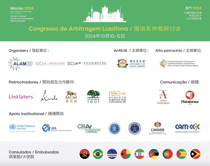 A Associação Portuguesa de Arbitragem (APA) tem muito gosto em apoiar o 1.º Congresso de Arbitragem Lusófona, organizado pela Associação Lusófona de Arbitragem e Mediação (ALAM), em conjunto com o Shenzhen Court of International Arbitration e o South China International Arbitration Center (HK). O evento, subordinado ao tema “Harmonização na Arbitragem Sino-Lusófona: Unindo Culturas Jurídicas e Expandindo Oportunidades", terá lugar entre os dias 10 e 12 de outubro de 2024 na Universidade de São José, em Macau.
