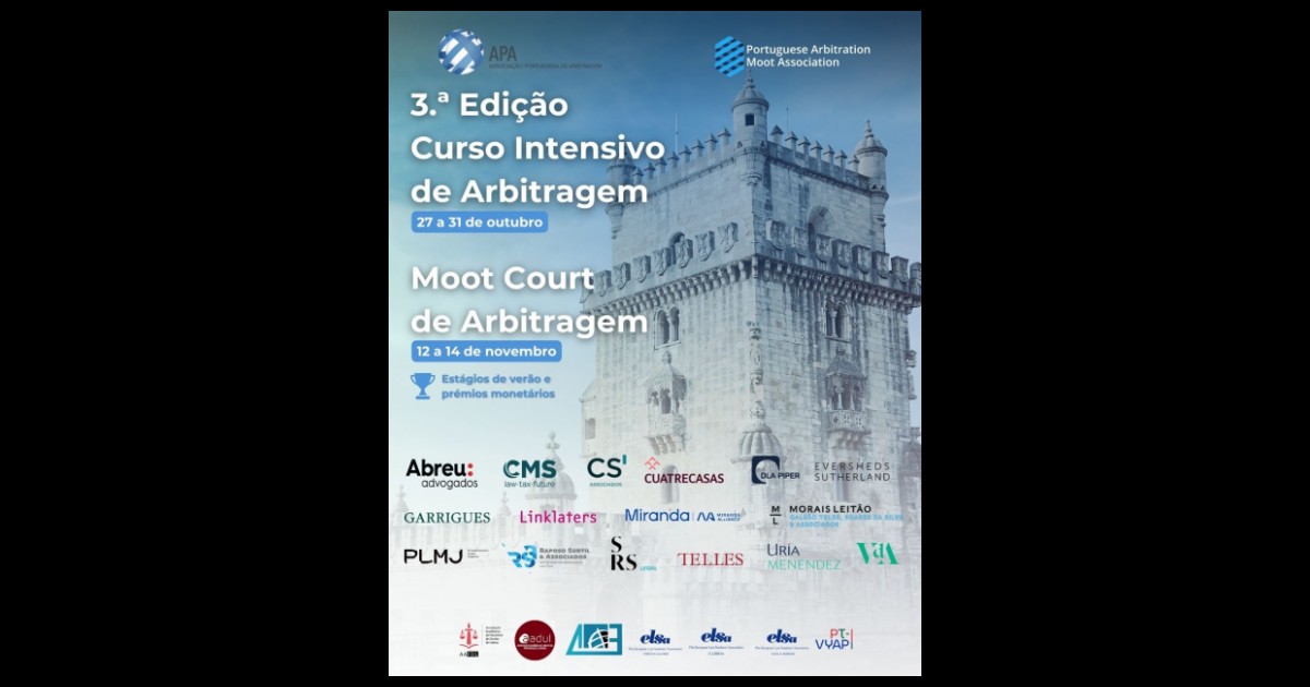 A Associação Portuguesa de Arbitragem (APA) e a Portuguese Arbitration Moot Association (PAMA) apresentam o cartaz oficial da 3.ª edição do Curso Intensivo e Moot Court de Arbitragem, iniciativa que volta a reunir profissionais e académicos de referência no domínio da arbitragem em Portugal.