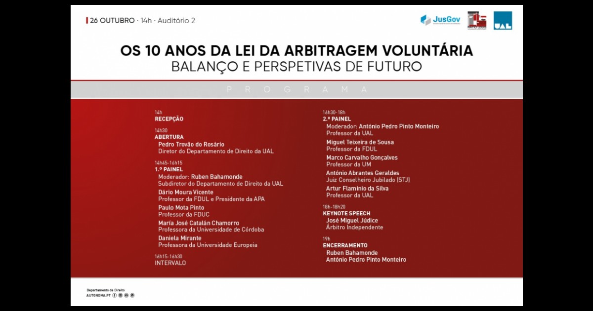 No próximo dia 26 de Outubro (4.ª feira) terá lugar a conferência “Os 10 anos da Lei da Arbitragem Voluntária: balanço e perspetivas de futuro”.